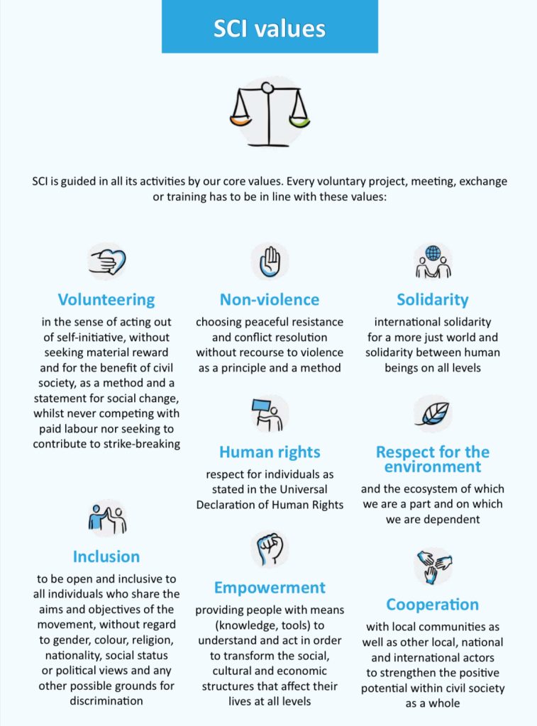 Man önskar även stärka volontärerna genom fredsutbildning, som ger möjligheter att agera för ett samhälle där människor lever tillsammans i fred utan att ta till våld. Dessvärre högaktuella och angelägna ämnen. Läs om våra värderingar.